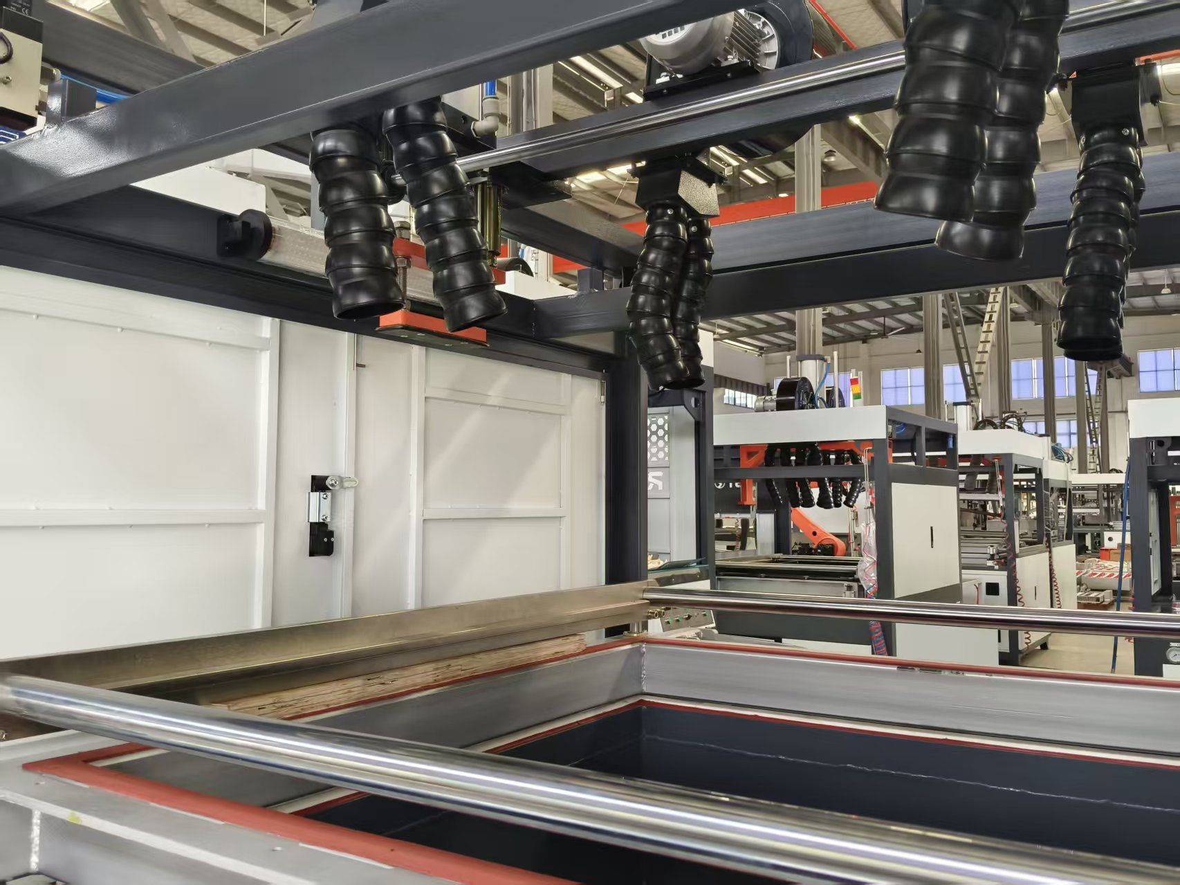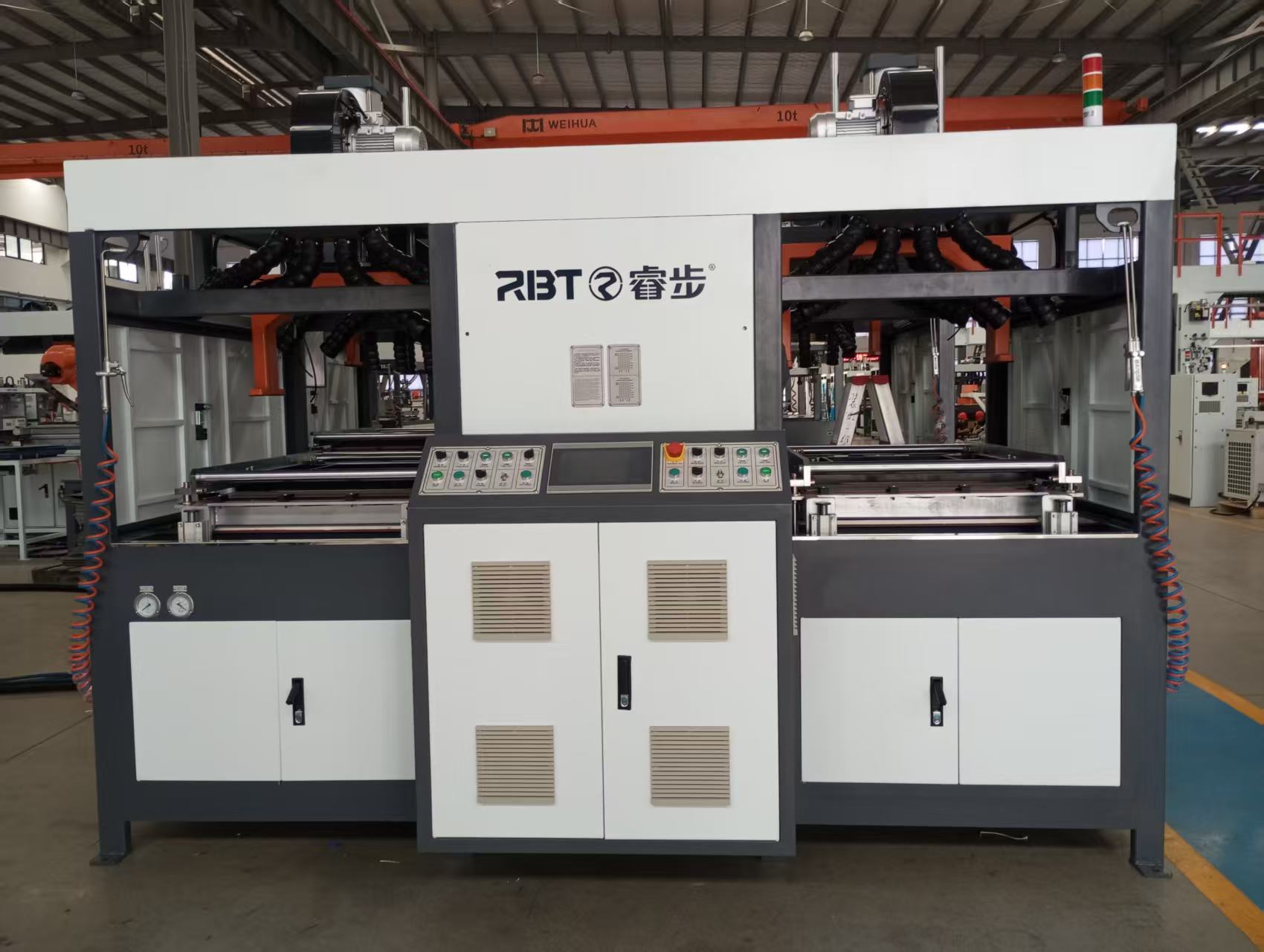 Um die Stabilität von Polycarbonat-Materialien während des Erhitzungsprozesses zu gewährleisten, ist das Gerät mit einem Laser-Entfernungsmesser ausgestattet, der verhindert, dass die Platten aufgrund von Überhitzung herunterfallen. Darüber hinaus gewährleistet die Konstruktion der Vakuumbox eine ausreichende Vakuumkapazität. Sowohl die linke als auch die rechte Formstation sind mit Blasgeräten, einem kleinen Vakuum beim ersten Mal, einem großen Vakuum beim zweiten Mal und Entformungsblasvorrichtungen ausgestattet, und die Durchflussrate wird durch den Absperrschieberschalter präzise gesteuert.