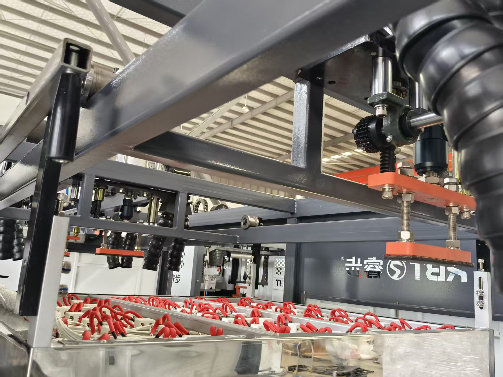 Das Gerät unterstützt sowohl manuelle als auch automatische Betriebsmodi und eignet sich für Bediener mit unterschiedlichem Erfahrungsniveau. Um die Sicherheit zu gewährleisten, sind an den Be- und Entladepositionen Infrarotgitter angebracht, die ein versehentliches Herunterfallen des Rahmens verhindern. Die Bedienoberfläche ist benutzerfreundlich und alle Parameter können in Echtzeit angepasst werden. Es unterstützt auch die Funktion zum Speichern von Rezepten und ist daher besonders für Kunststoffplattenextruder geeignet.